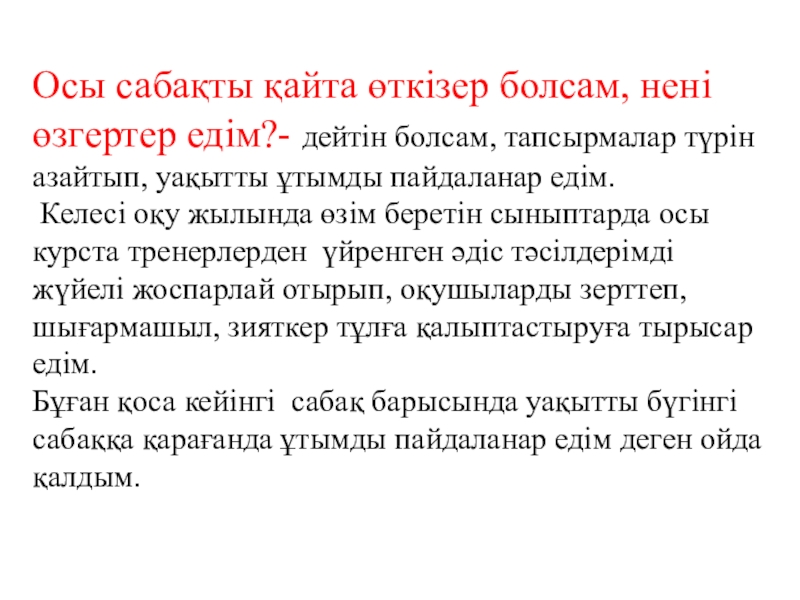 Бұған қоса кейінгі сабақ барысында уақытты бүгінгі сабаққа қарағанда ұтымды пайдаланар едім деген ойда қалдым.