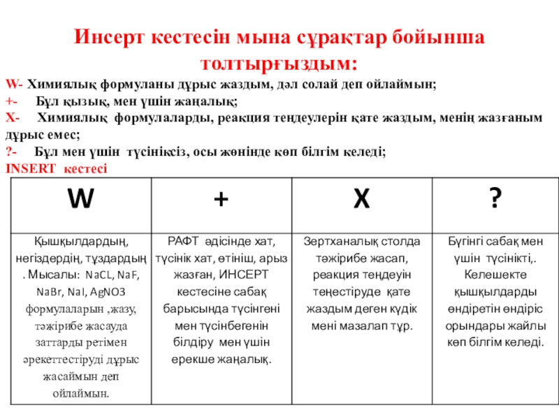 Слайд 67Инсерт кестесін мына сұрақтар бойынша толтырғыздым: