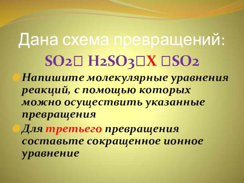 Дана схема превращений:SO2 H2SO3X SO2Напишите молекулярные уравнения реакций, с помощью которых можно осуществить указанные превращенияДля третьего превращения