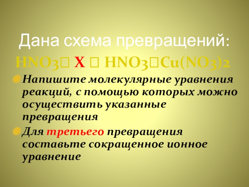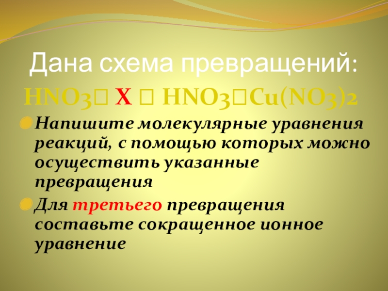 Дана схема превращений:HNO3 X  HNO3Cu(NO3)2Напишите молекулярные уравнения реакций, с помощью которых можно осуществить указанные превращенияДля третьего