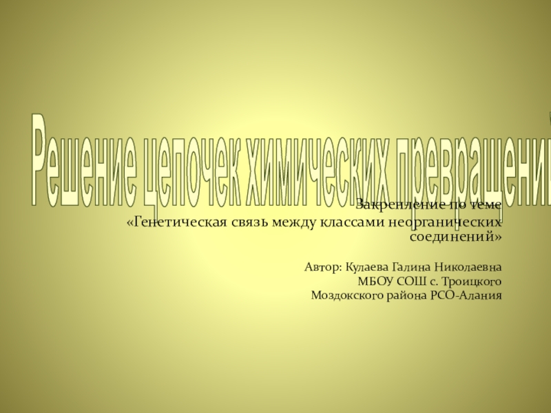 Решение цепочек химических превращенийЗакрепление по теме«Генетическая связь между классами неорганических соединений» Автор: Кулаева Галина НиколаевнаМБОУ СОШ с.