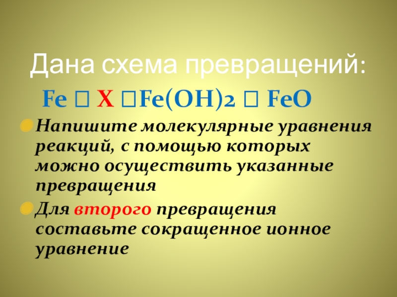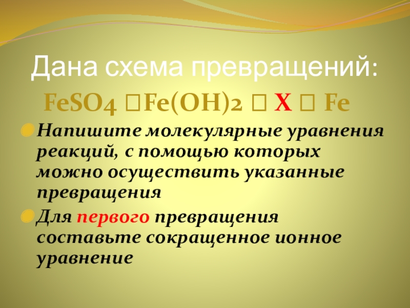 Дана схема превращений:  FeSO4 Fe(OH)2  X  FeНапишите молекулярные уравнения реакций, с помощью которых можно