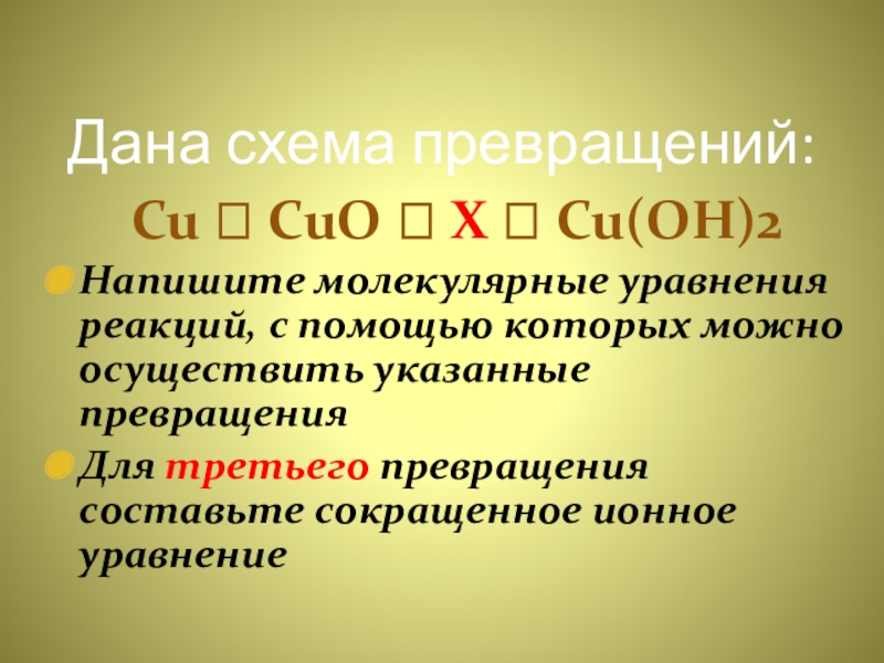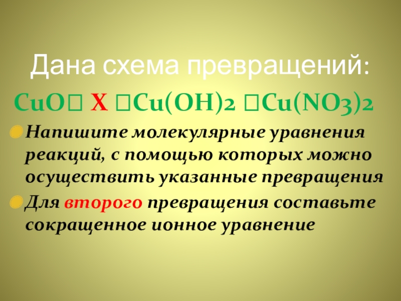 Дана схема превращений:Cu  CuO  X  Cu(OH)2Напишите молекулярные уравнения реакций, с помощью которых можно осуществить