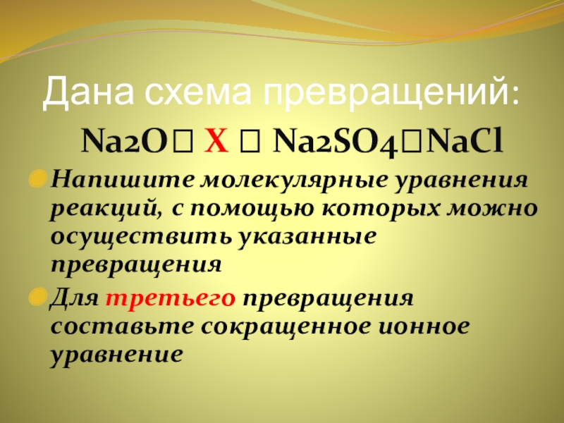 Дана схема превращений:Na2O X  Na2SO4NaClНапишите молекулярные уравнения реакций, с помощью которых можно осуществить указанные превращенияДля третьего