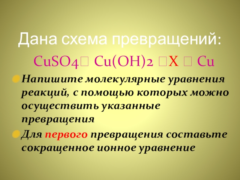 Дана схема превращений:СuSO4 Cu(OH)2 X  CuНапишите молекулярные уравнения реакций, с помощью которых можно осуществить указанные превращенияДля