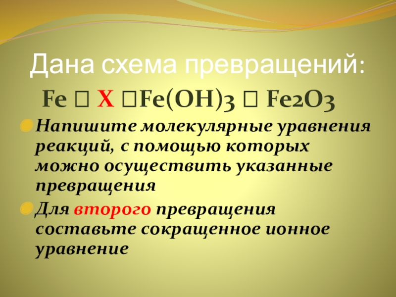 Дана схема превращений: Fe  X Fe(OH)3  Fe2O3Напишите молекулярные уравнения реакций, с помощью которых можно осуществить указанные превращенияДля второго превращения составьте сокращенное ионное уравнение