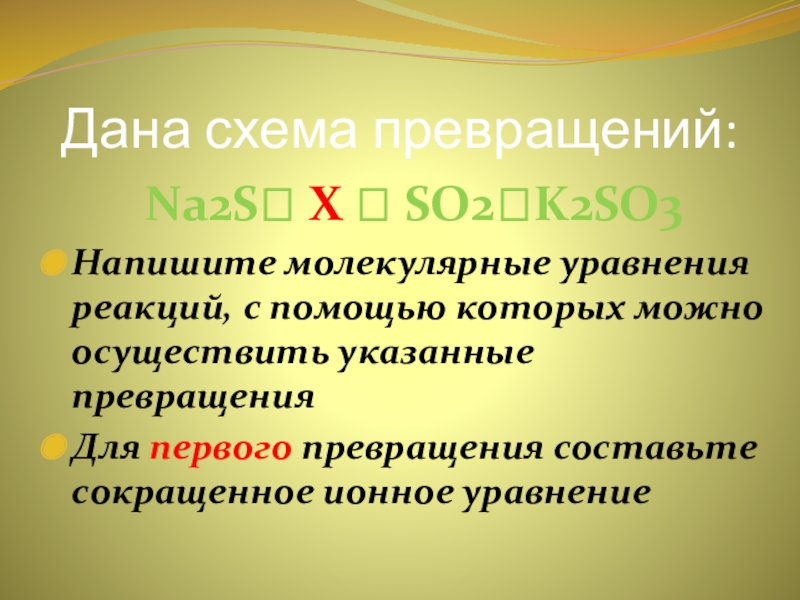 Дана схема превращений:Nа2S X  SO2K2SO3Напишите молекулярные уравнения реакций, с помощью которых можно осуществить указанные превращенияДля первого