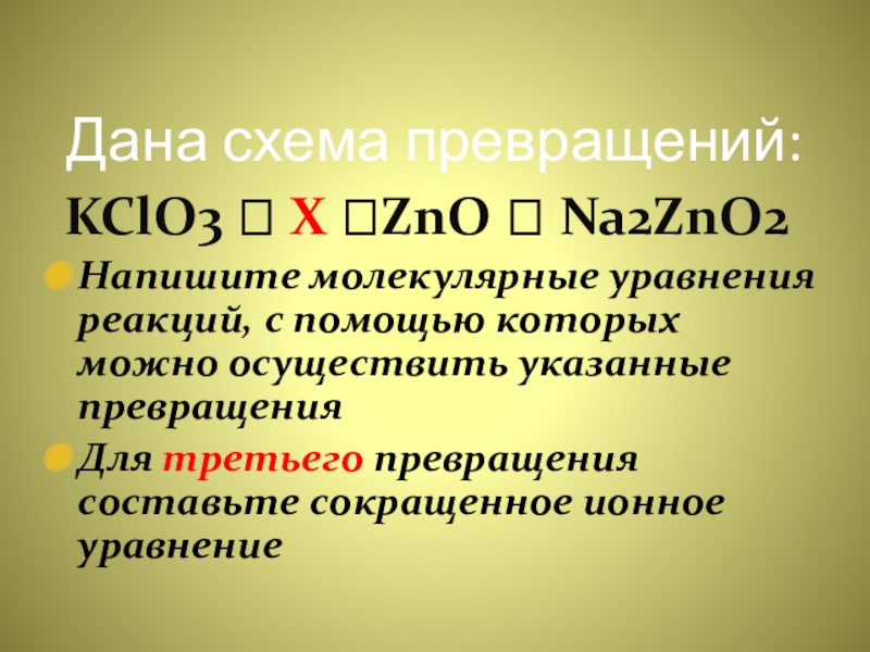 Дана схема превращений: KClO3  X ZnO  Na2ZnO2Напишите молекулярные уравнения реакций, с помощью которых можно осуществить