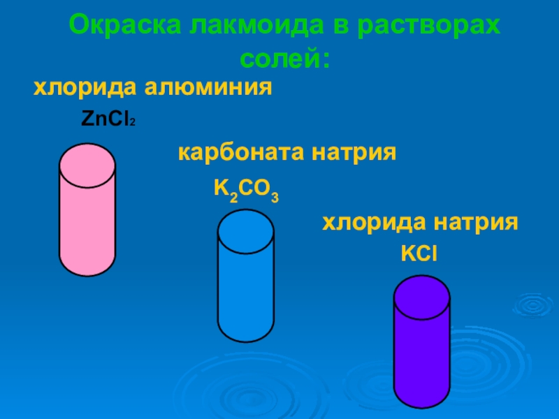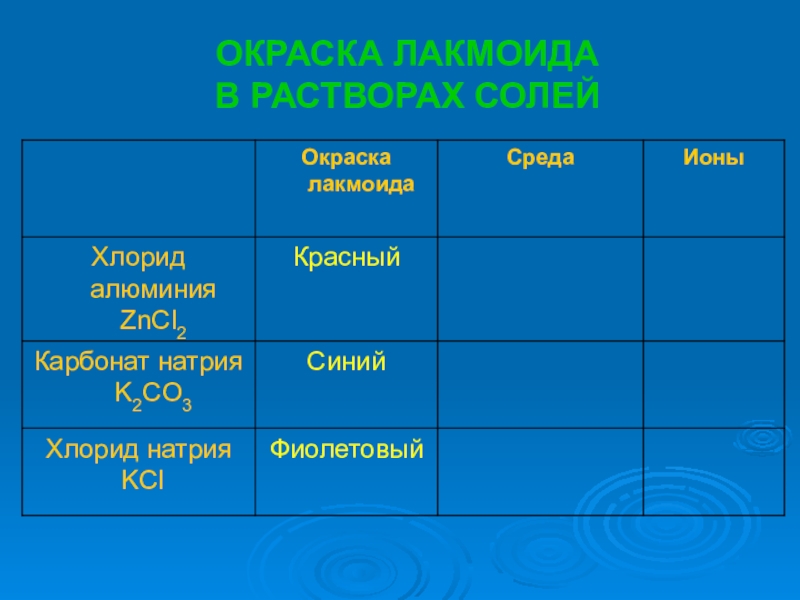 Слайд 7ОКРАСКА ЛАКМОИДА В РАСТВОРАХ СОЛЕЙ