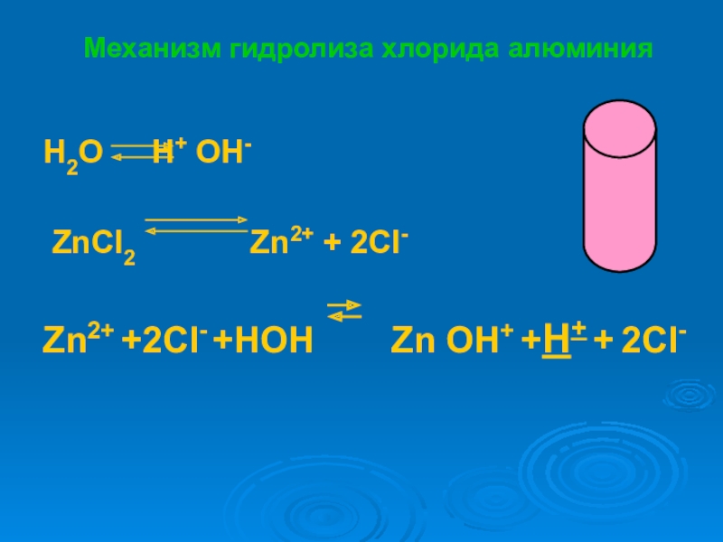 Механизм гидролиза хлорида алюминияH2O 	H+ OH- ZnCl2    	  Zn2+ + 2Cl-Zn2+ +2Cl- +HOH