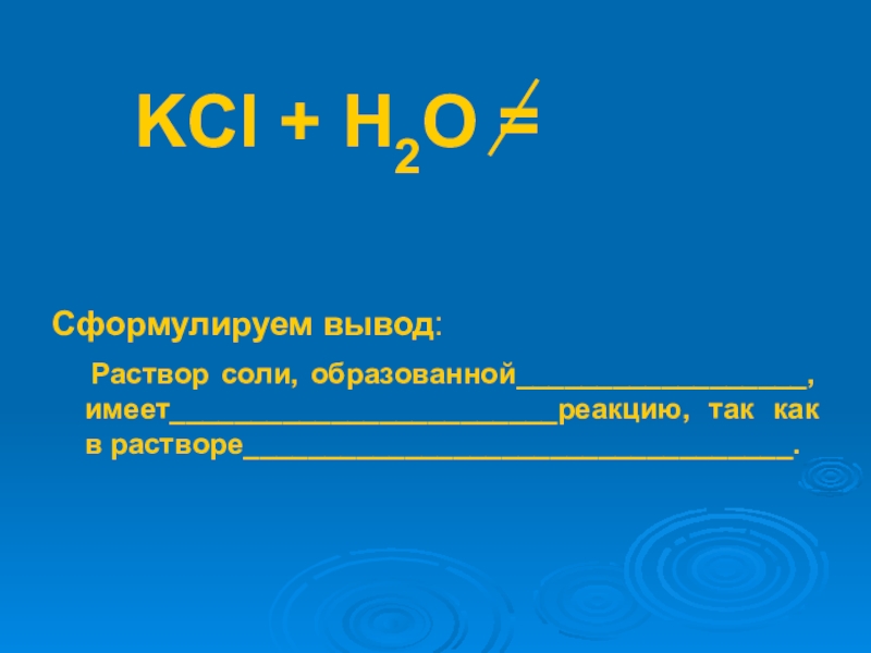 KCl + Н2О = Сформулируем вывод:  Раствор соли, образованной__________________, имеет________________________реакцию, так как в растворе__________________________________.