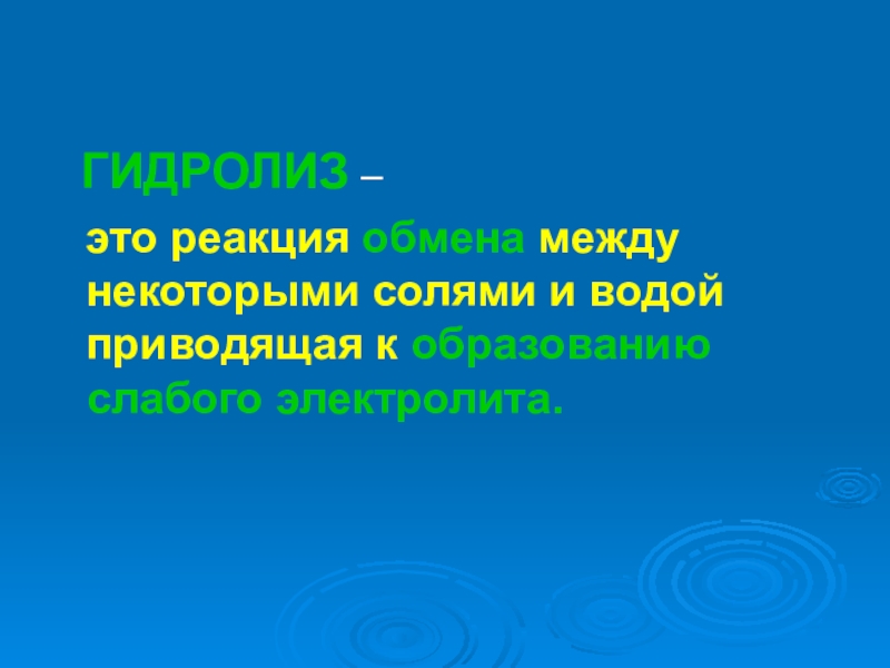 ГИДРОЛИЗ –  это реакция обмена между некоторыми солями и водой приводящая к образованию