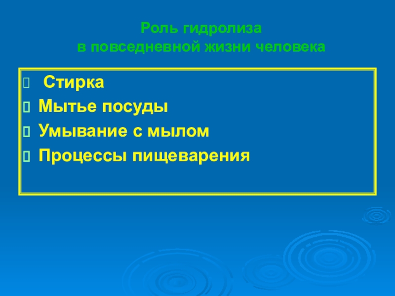 Роль гидролиза  в повседневной жизни человека СтиркаМытье посудыУмывание с мыломПроцессы пищеварения