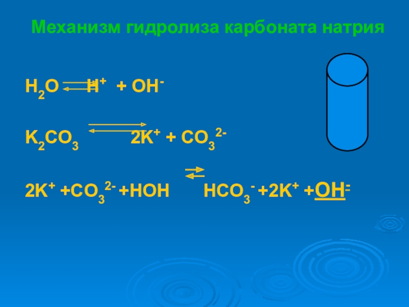 Механизм гидролиза карбоната натрияH2O 	H+ + OH-K2CO3       	 2K+ + CO32-	2K+