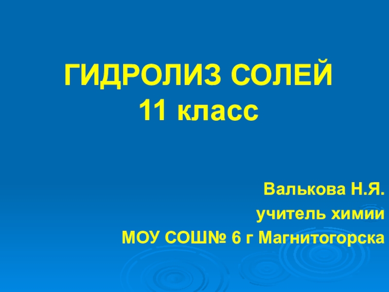 ГИДРОЛИЗ СОЛЕЙ 11 класс  Валькова Н.Я.учитель химии МОУ СОШ№ 6 г Магнитогорска