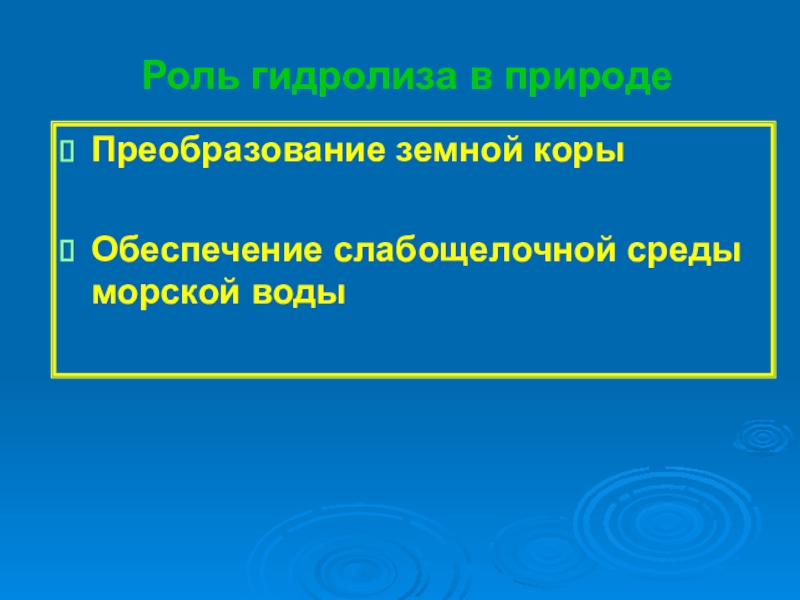 Роль гидролиза в природеПреобразование земной коры Обеспечение слабощелочной среды морской воды