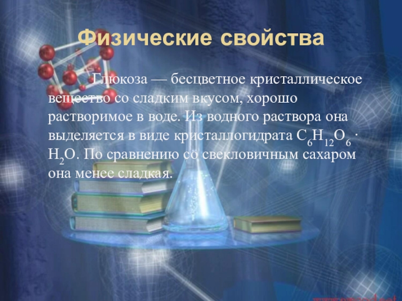 бесцветное кристаллическое вещество со сладким вкусом, хорошо растворимое в воде. Из водного раствора она выделяется в виде кристаллогидрата C6H12O6 ∙ H2O. По сравнению со свекловичным сахаром она менее сладкая.