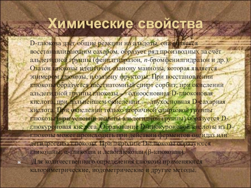образует ряд производных за счёт альдегидной группы (фенилгидразон, n-бромфенилгидразон и др.). Озазон глюкозы идентичен озанону маннозы, которая является эпимером глюкозы, и озазону фруктозы. При восстановлении глюкозы образуется шестиатомный спирт сорбит; при окислении альдегидной группы глюкозы — одноосновная D-глюконовая кислота, при дальнейшем окислении — двухосновная D-сахарная кислота. При окислении только вторичной спиртовой группы глюкозы (при условии защиты альдегидной группы) образуется D-глюкуроновая кислота. Образование D-глюкуроновой кислоты из D-глюкозы может происходить при действии ферментов оксидаз или дегидрогеназ глюкозы. При пиролизе D-глюкозы образуются гликозаны: α-гликозан и левоглюкозан (β-глюкозан).