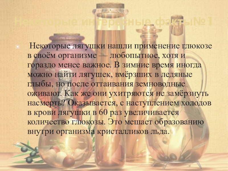 — любопытное, хотя и гораздо менее важное. В зимние время иногда можно найти лягушек, вмёрзших в ледяные глыбы, но после оттаивания земноводные оживают. Как же они ухитряются не замёрзнуть насмерть? Оказывается, с наступлением холодов в крови лягушки в 60 раз увеличивается количество глюкозы. Это мешает образованию внутри организма кристалликов льда.