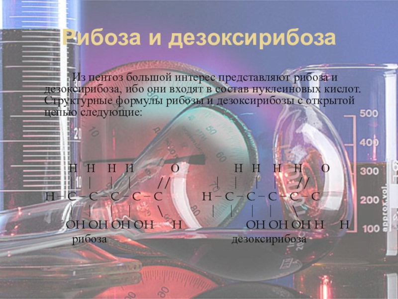 пентоз большой интерес представляют рибоза и дезоксирибоза, ибо они входят в состав нуклеиновых кислот. Структурные формулы рибозы и дезоксирибозы с открытой цепью следующие: