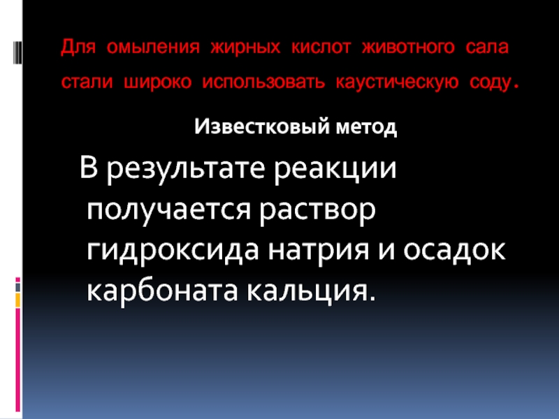 Слайд 52Для омыления жирных кислот животного сала стали широко использовать каустическую соду.
