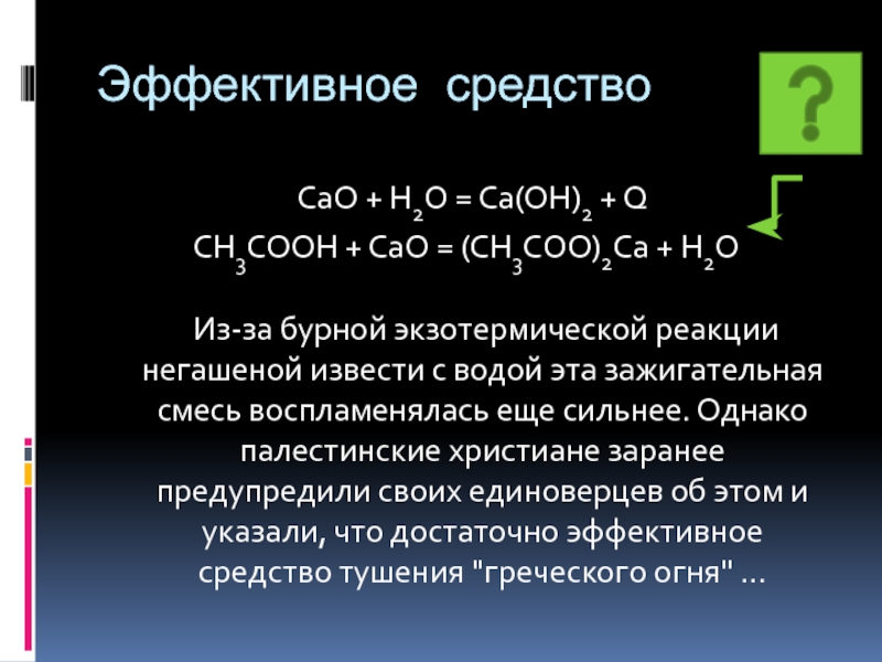 Из-за бурной экзотермической реакции негашеной извести с водой эта зажигательная смесь воспламенялась еще сильнее. Однако палестинские христиане заранее предупредили своих единоверцев об этом и указали, что достаточно эффективное средство тушения "греческого огня" …