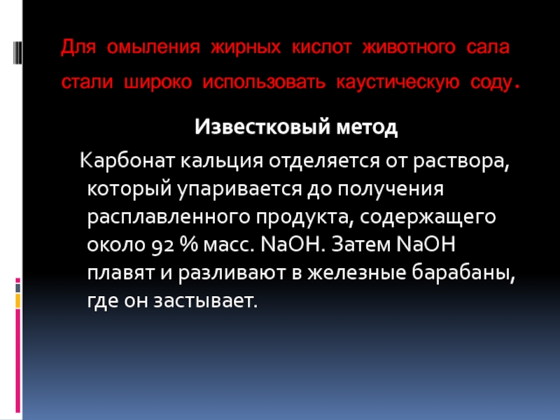 Слайд 54Для омыления жирных кислот животного сала стали широко использовать каустическую соду.