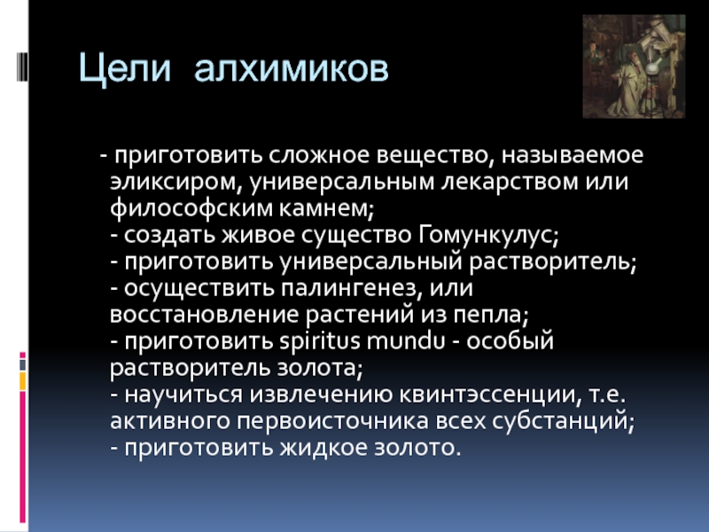 - приготовить сложное вещество, называемое эликсиром, универсальным лекарством