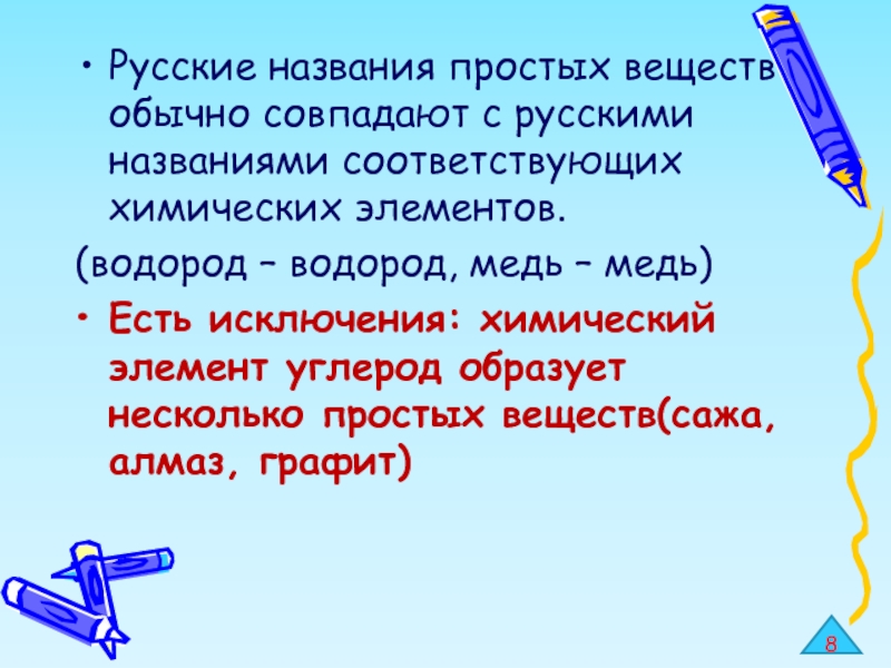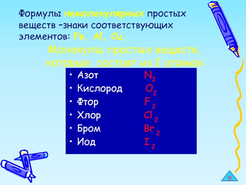 Формулы немолекулярных простых веществ –знаки соответствующих элементов: Fe, Al, Cu,