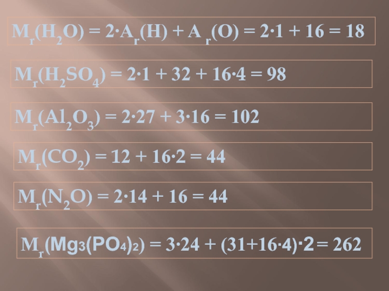 Мr(Н2SО4) = 2∙1 + 32 + 16∙4 = 98