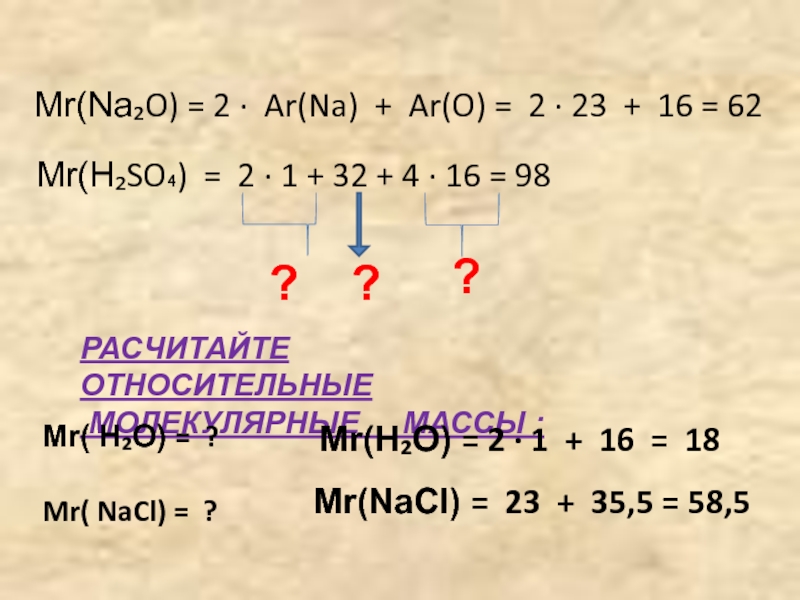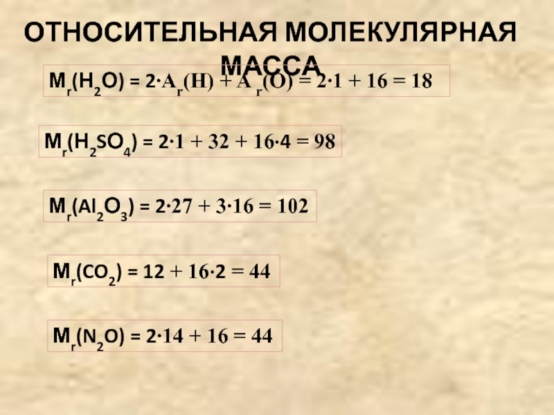 Мr(Н2SО4) = 2∙1 + 32 + 16∙4 = 98