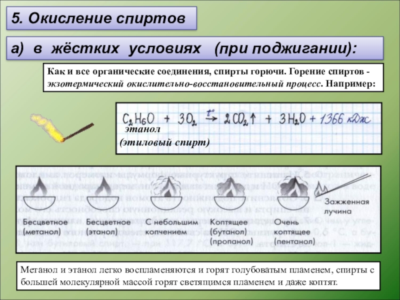 Метанол и этанол легко воспламеняются и горят голубоватым пламенем, спирты с большей молекулярной массой горят светящимся пламенем и даже коптят.