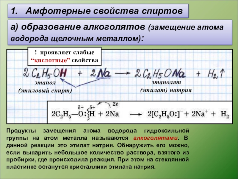 Продукты замещения атома водорода гидроксильной группы на атом металла называются алкоголятами. В данной реакции это этилат натрия. Обнаружить его можно, если выпарить небольшое количество раствора, взятого из пробирки, где происходила реакция. При этом на стеклянной пластинке останутся кристаллики этилата натрия.