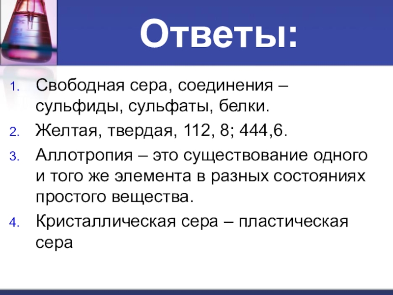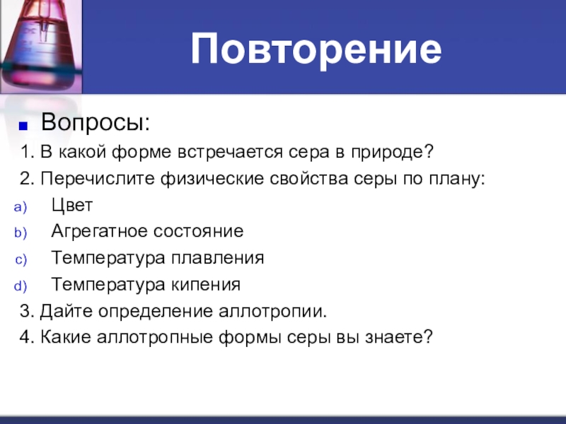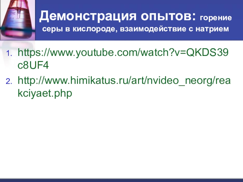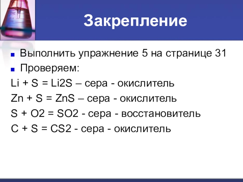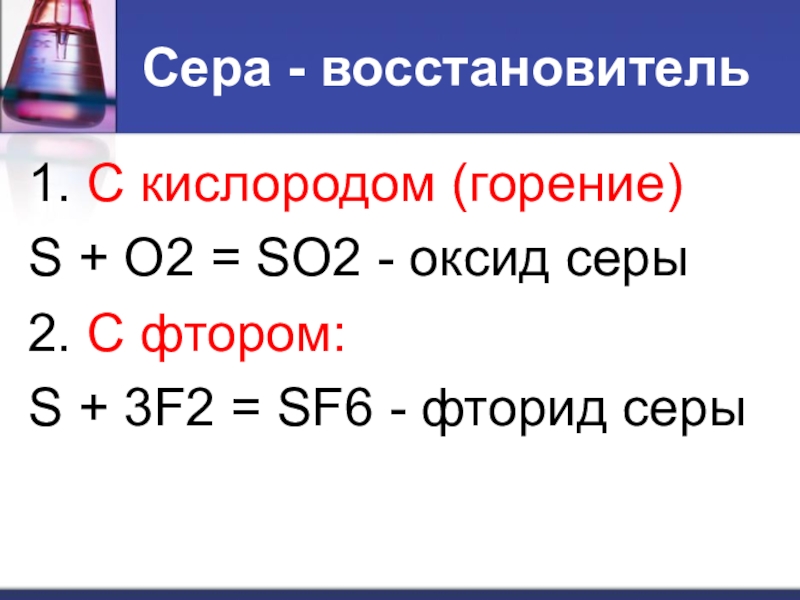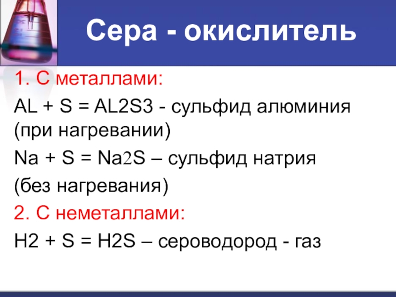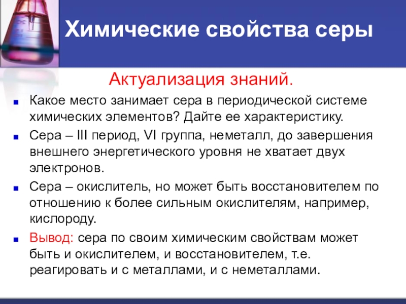 Научиться записывать уравнения химических реакций серы с разными веществами.