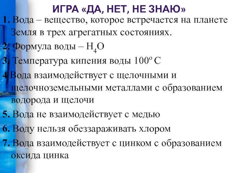 7. Вода взаимодействует с цинком с образованием оксида цинка