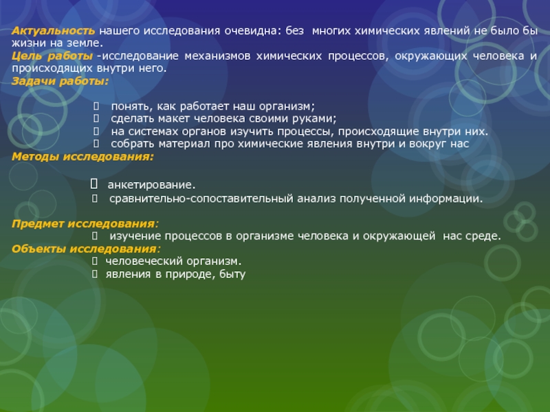 Цель работы -исследование механизмов химических процессов, окружающих человека и происходящих внутри него.