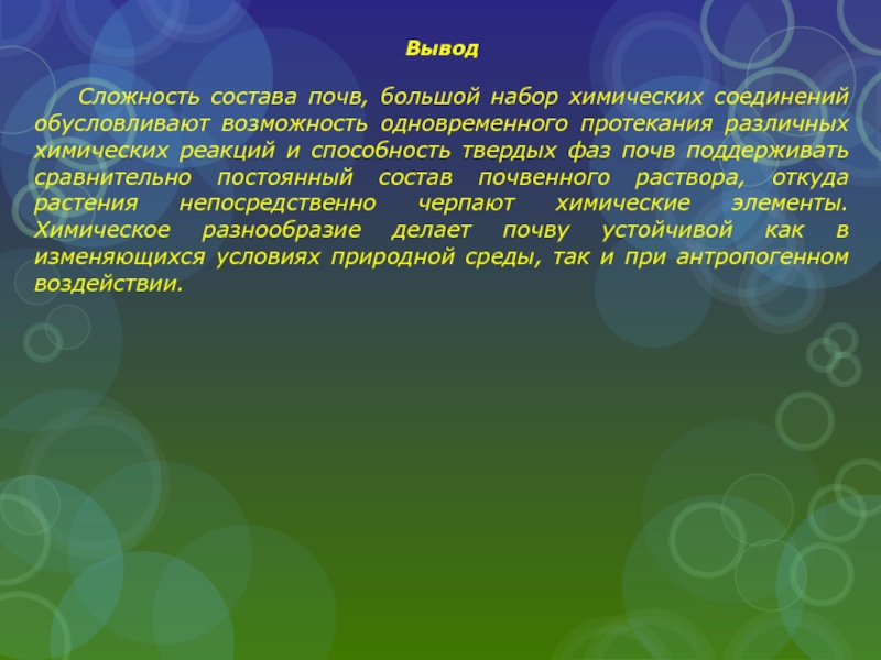 протекания различных химических реакций и способность твердых фаз почв поддерживать сравнительно постоянный состав почвенного раствора, откуда растения непосредственно черпают химические элементы. Химическое разнообразие делает почву устойчивой как в изменяющихся условиях природной среды, так и при антропогенном воздействии.