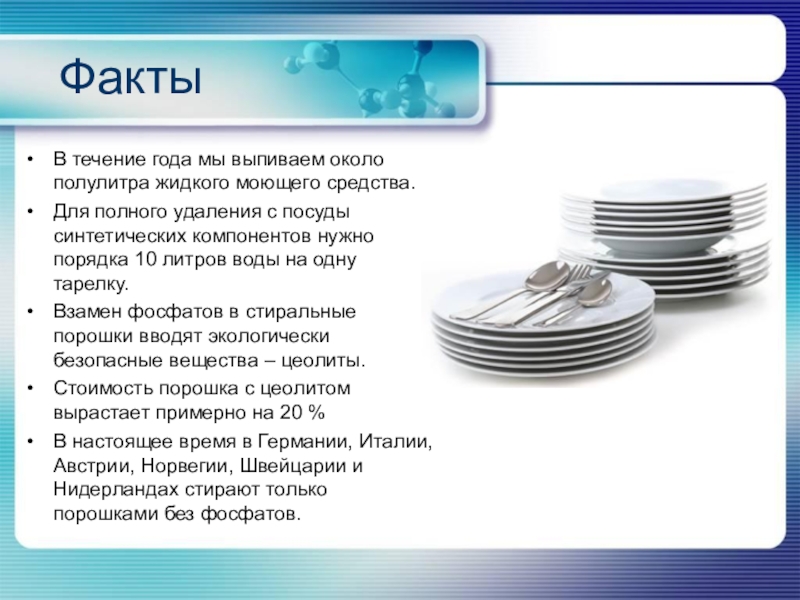 ФактыВ течение года мы выпиваем около полулитра жидкого моющего средства.Для полного удаления с посуды синтетических компонентов нужно