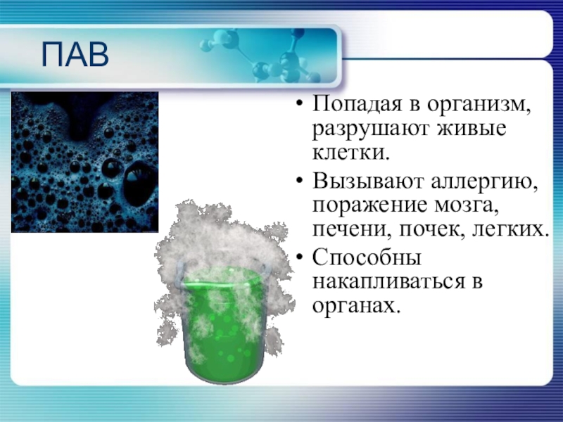 ПАВПопадая в организм, разрушают живые клетки.Вызывают аллергию, поражение мозга, печени, почек, легких.Способны накапливаться в органах.