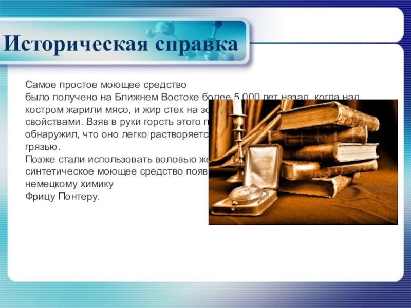 Историческая справкаСамое простое моющее средство  было получено на Ближнем Востоке более 5 000 лет назад, когда