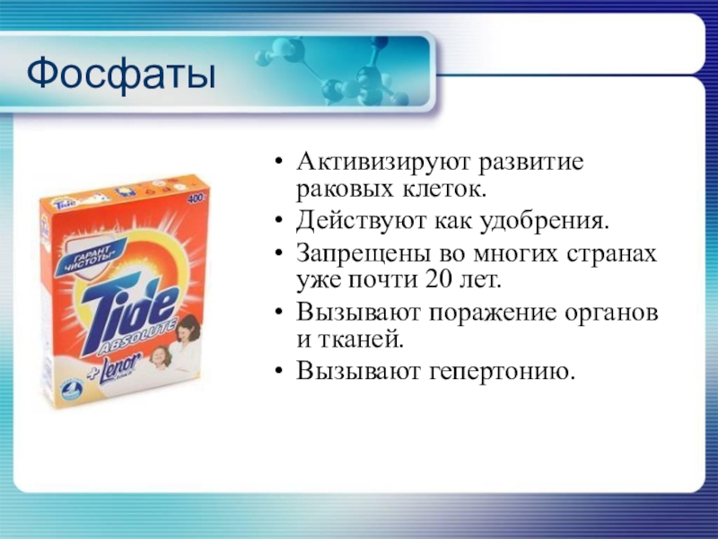 ФосфатыАктивизируют развитие раковых клеток.Действуют как удобрения.Запрещены во многих странах уже почти 20 лет.Вызывают поражение органов и тканей.Вызывают