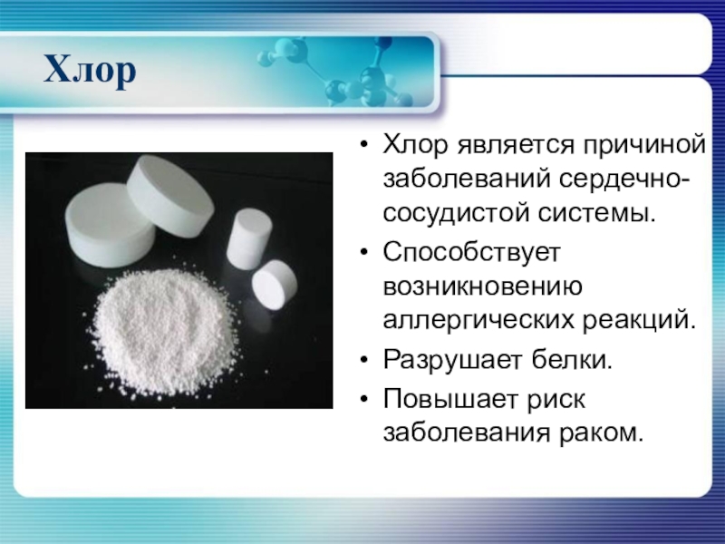 ХлорХлор является причиной заболеваний сердечно-сосудистой системы. Способствует возникновению аллергических реакций.Разрушает белки. Повышает риск заболевания раком.