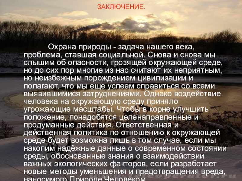 задача нашего века, проблема, ставшая социальной. Снова и снова мы слышим об опасности, грозящей окружающей среде, но до сих пор многие из нас считают их неприятным, но неизбежным порождением цивилизации и полагают, что мы еще успеем справиться со всеми выявившимися затруднениями. Однако воздействие человека на окружающую среду приняло угрожающие масштабы. Чтобы в корне улучшить положение, понадобятся целенаправленные и продуманные действия. Ответственная и действенная политика по отношению к окружающей среде будет возможна лишь в том случае, если мы накопим надёжные данные о современном состоянии среды, обоснованные знания о взаимодействии важных экологических факторов, если разработает новые методы уменьшения и предотвращения вреда, наносимого Природе Человеком.