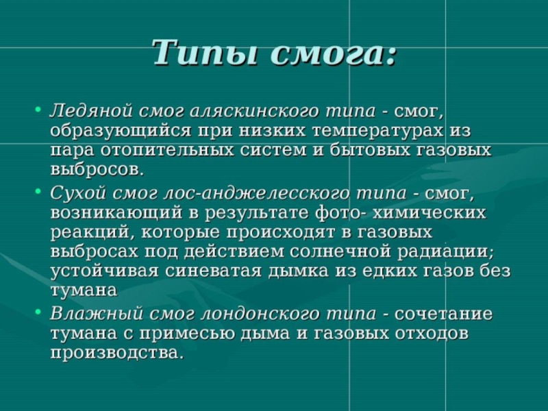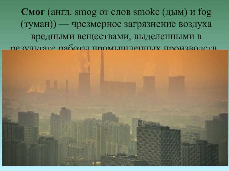 Слайд 20Смог (англ. smog от слов smoke (дым) и fog (туман)) — чрезмерное