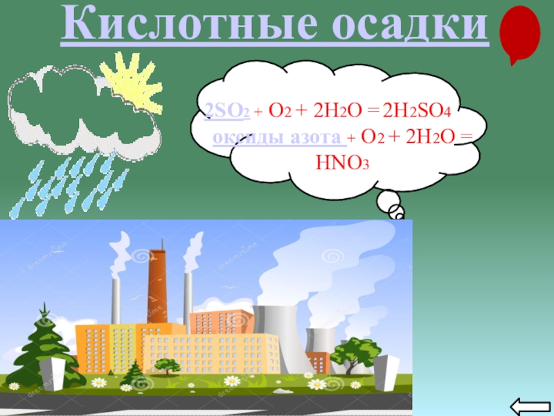 2SO2 + O2 + 2H2O = 2H2SO4оксиды азота + O2 + 2H2O = HNO3Кислотные осадки