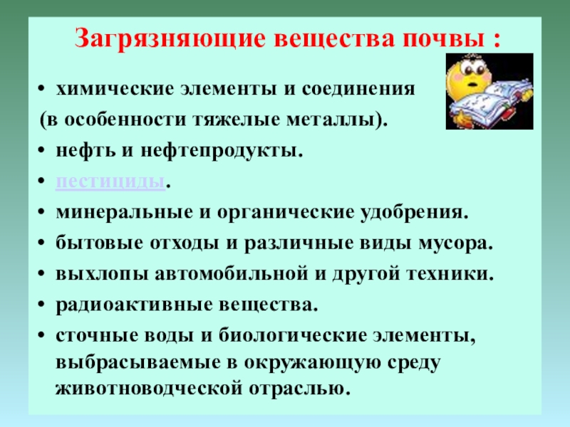 Загрязняющие вещества почвы :химические элементы и соединения (в особенности тяжелые металлы).нефть и нефтепродукты.пестициды.минеральные и органические удобрения.бытовые