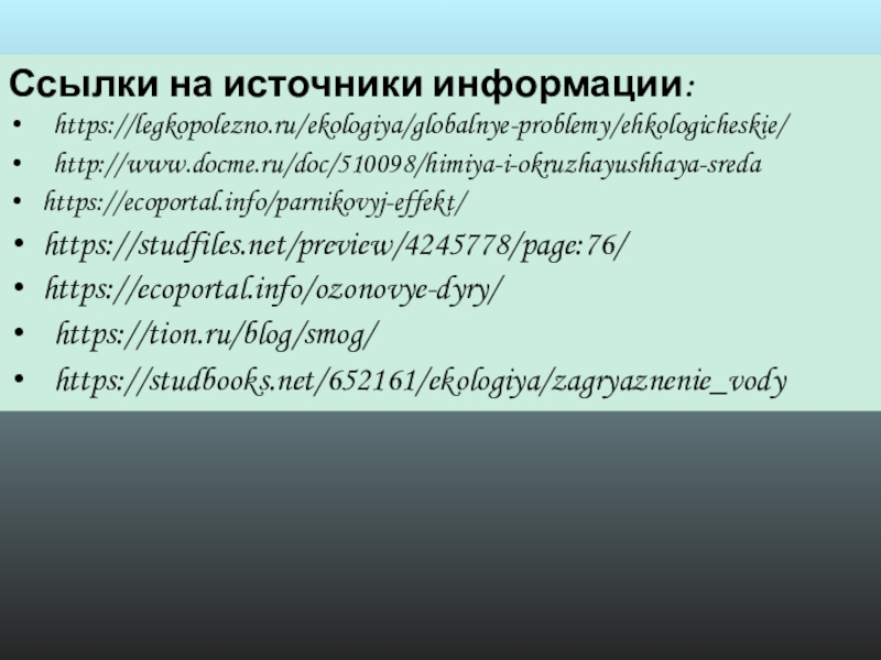 Ссылки на источники информации:https://legkopolezno.ru/ekologiya/globalnye-problemy/ehkologicheskie/http://www.docme.ru/doc/510098/himiya-i-okruzhayushhaya-sredahttps://ecoportal.info/parnikovyj-effekt/https://studfiles.net/preview/4245778/page:76/https://ecoportal.info/ozonovye-dyry/https://tion.ru/blog/smog/ https://studbooks.net/652161/ekologiya/zagryaznenie_vody