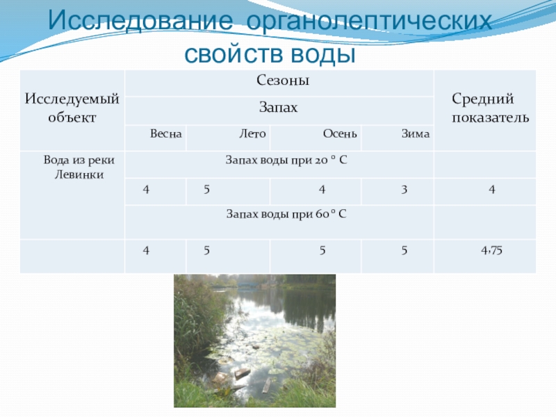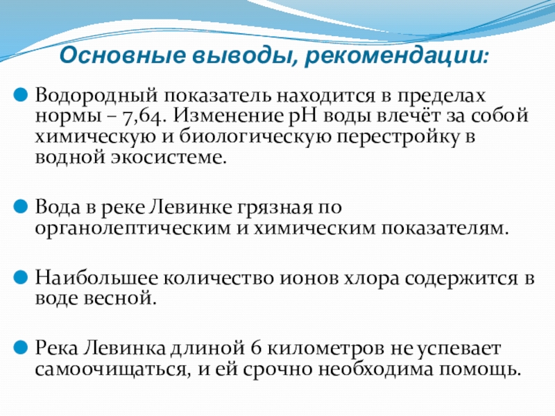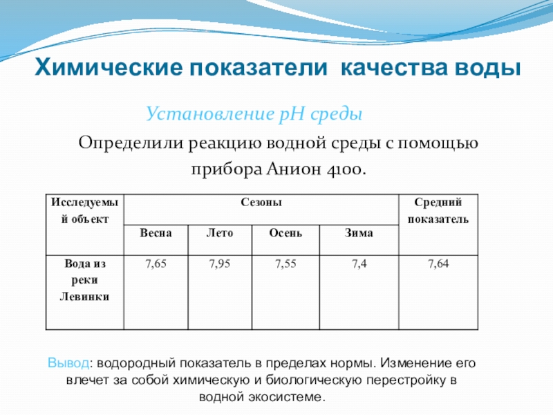 Вывод: водородный показатель в пределах нормы. Изменение его влечет за собой химическую и биологическую перестройку в водной экосистеме.