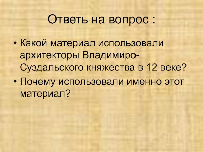 Ответь на вопрос :Какой материал использовали архитекторы Владимиро-Суздальского княжества в 12 веке?Почему использовали именно этот материал?