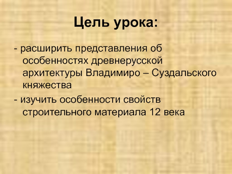 Цель урока:- расширить представления об особенностях древнерусской архитектуры Владимиро – Суздальского княжества- изучить особенности свойств строительного материала